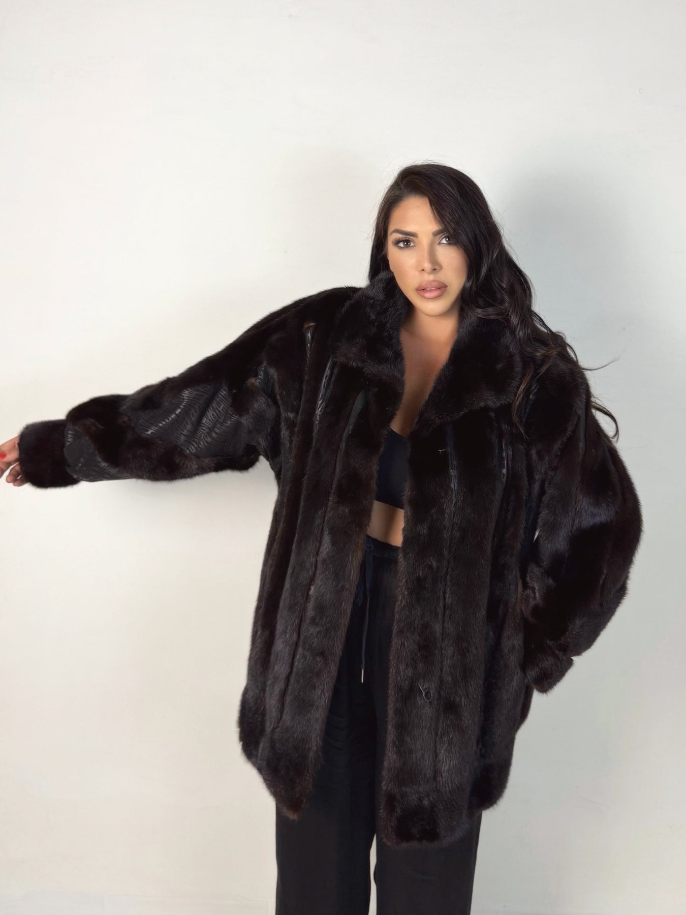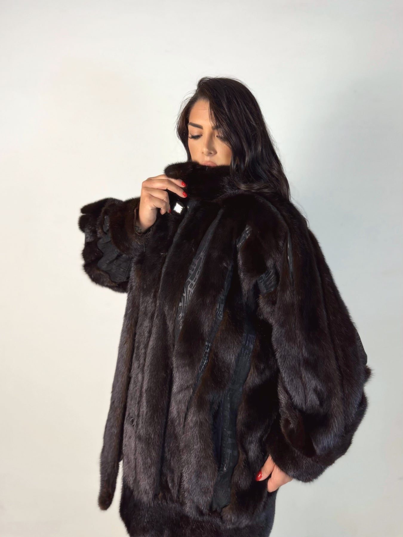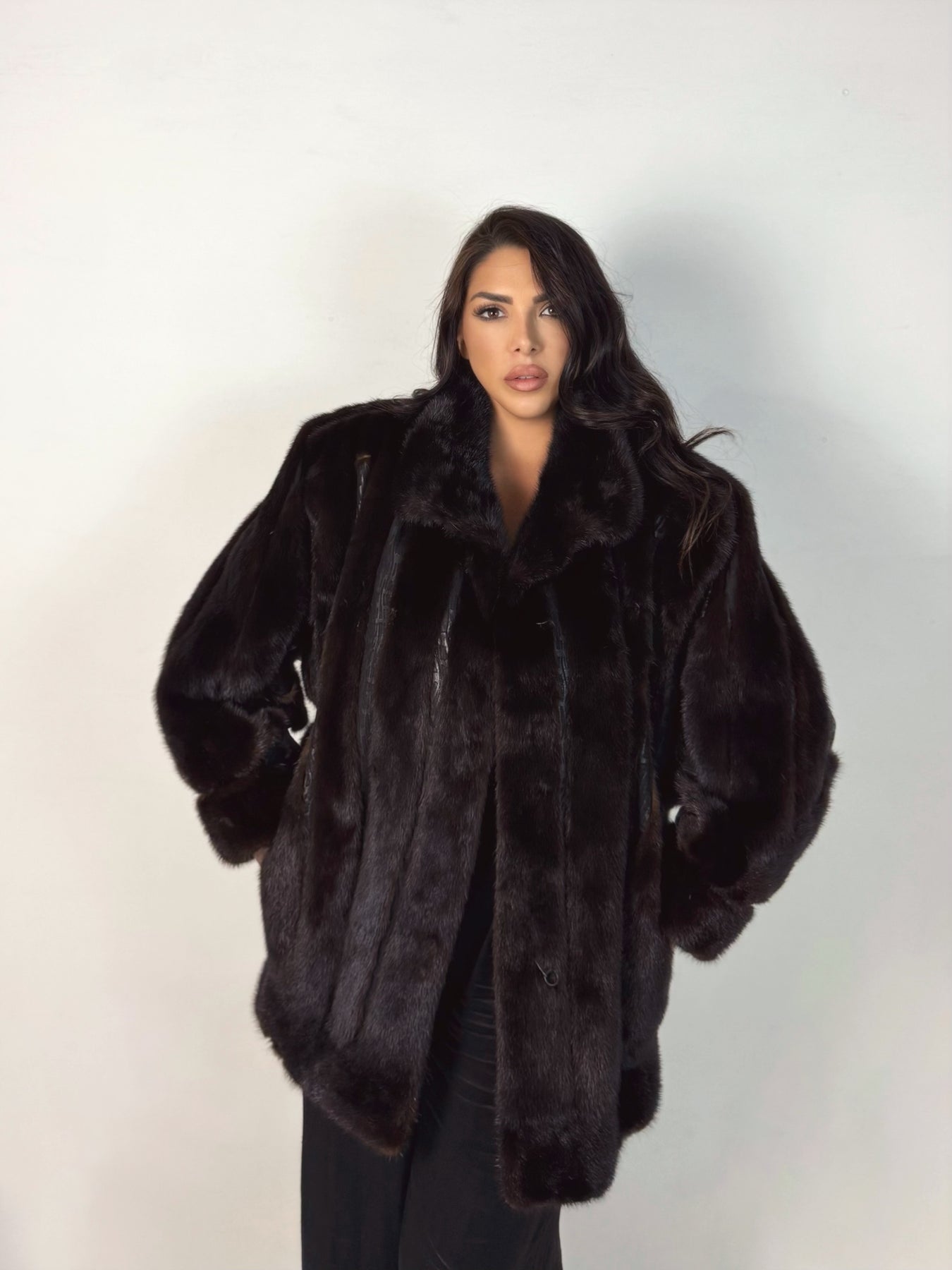 Un capospalla elegante e sofisticato: pelliccia in visone scuro, caratterizzata da una lavorazione a pelli verticali che esalta la luminosità naturale del manto. La linea dritta e la morbidezza del pelo rendono questo modello versatile, ideale per look sia formali che più casual chic. L’interno foderato con dettagli ricercati aggiunge un tocco di pregio, mentre il colore profondo e uniforme ne sottolinea l’eleganza senza tempo.