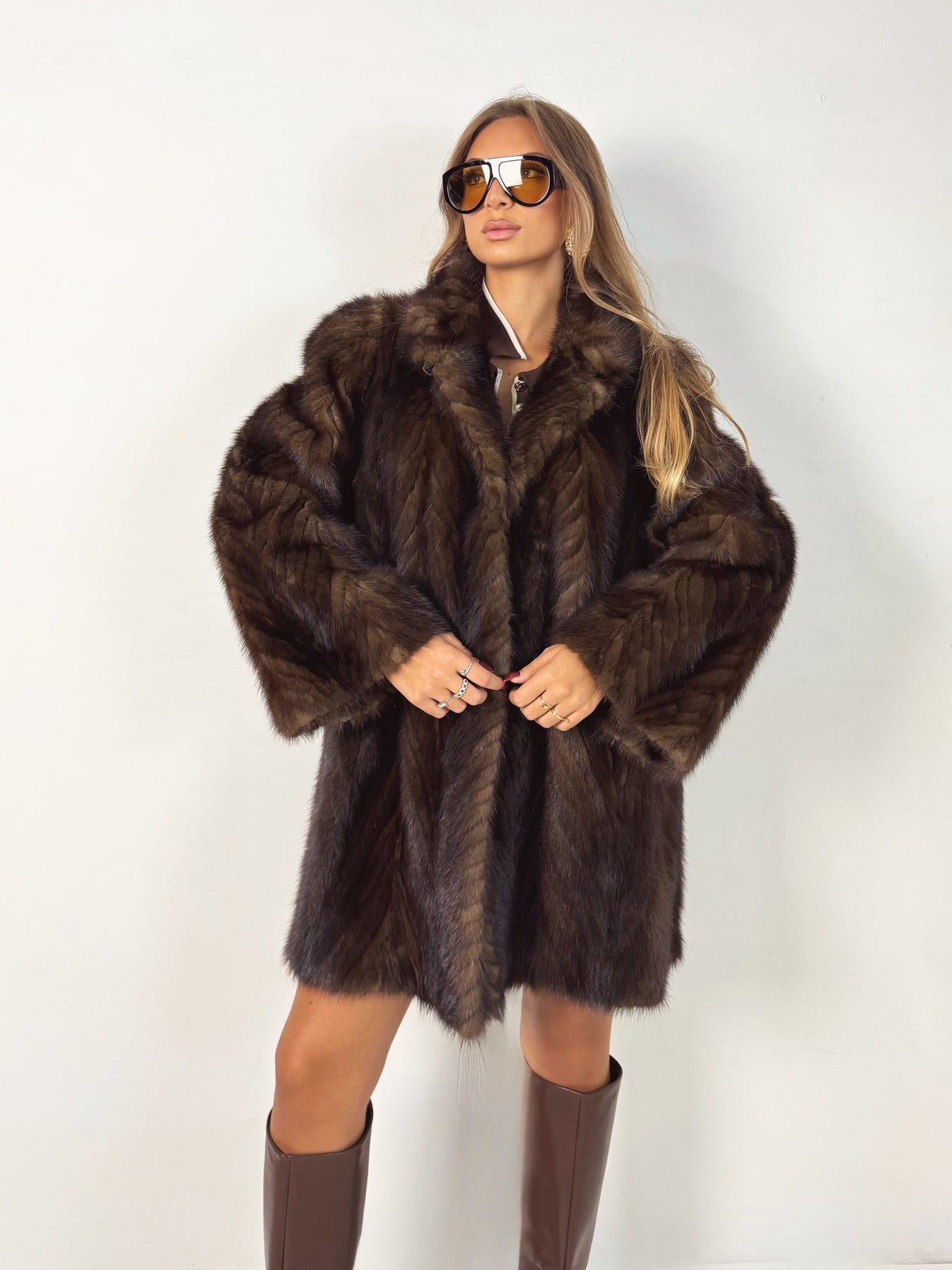 Un capo che incarna eleganza e prestigio: la pelliccia in visone naturale colpisce per il suo colore bruno profondo, esaltato dalla particolare lavorazione a spina di pesce che dona dinamismo e lucentezza. Un modello intramontabile, perfetto per chi ama distinguersi con classe ed esprimere uno stile sofisticato in ogni occasione.