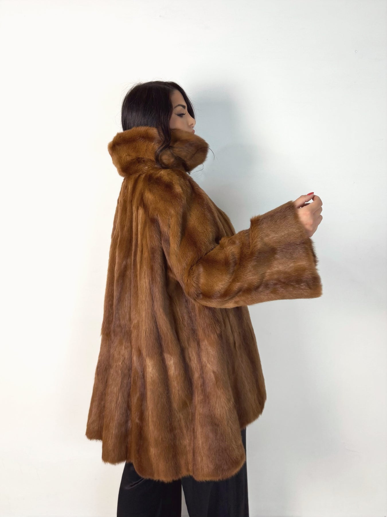 Il caldo tono marrone esalta la luminosità della pelliccia, rendendola versatile per occasioni eleganti o per outfit più quotidiani con un tocco chic.