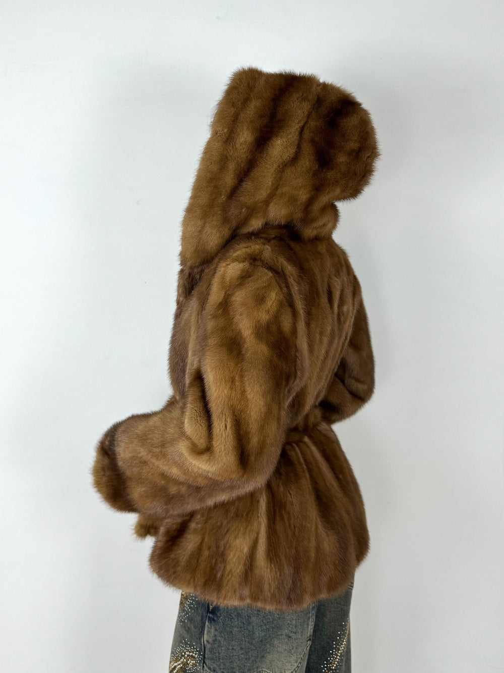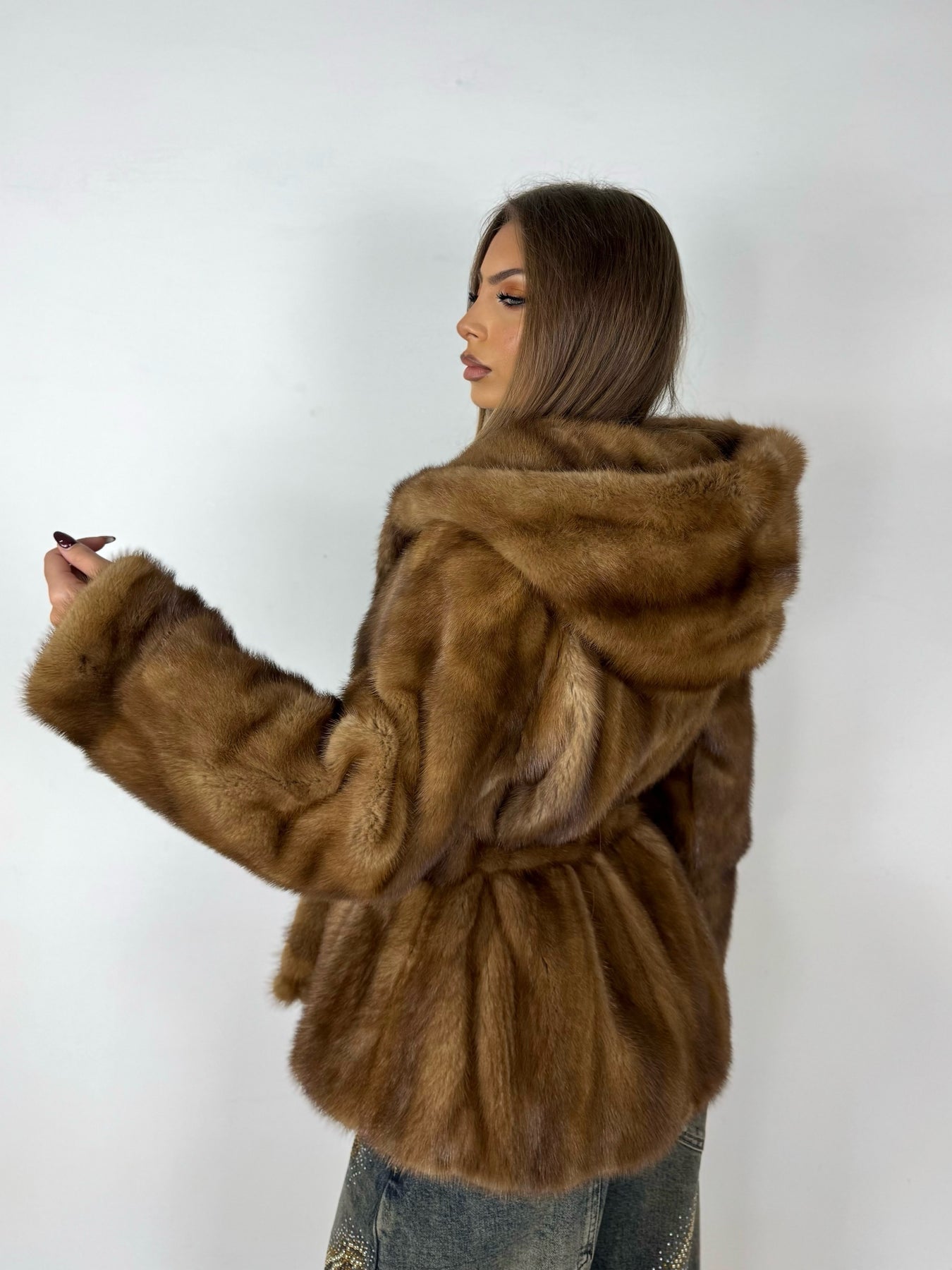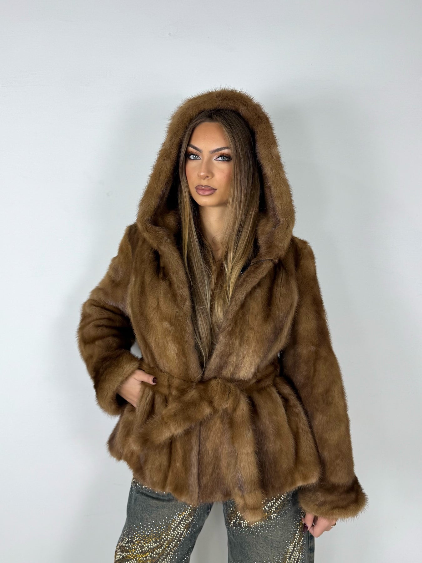 Un capo dal fascino autentico e intramontabile: giacca in visone naturale con cappuccio, caratterizzata da una linea avvitata e da sfumature calde e luminose che esaltano la bellezza del manto.