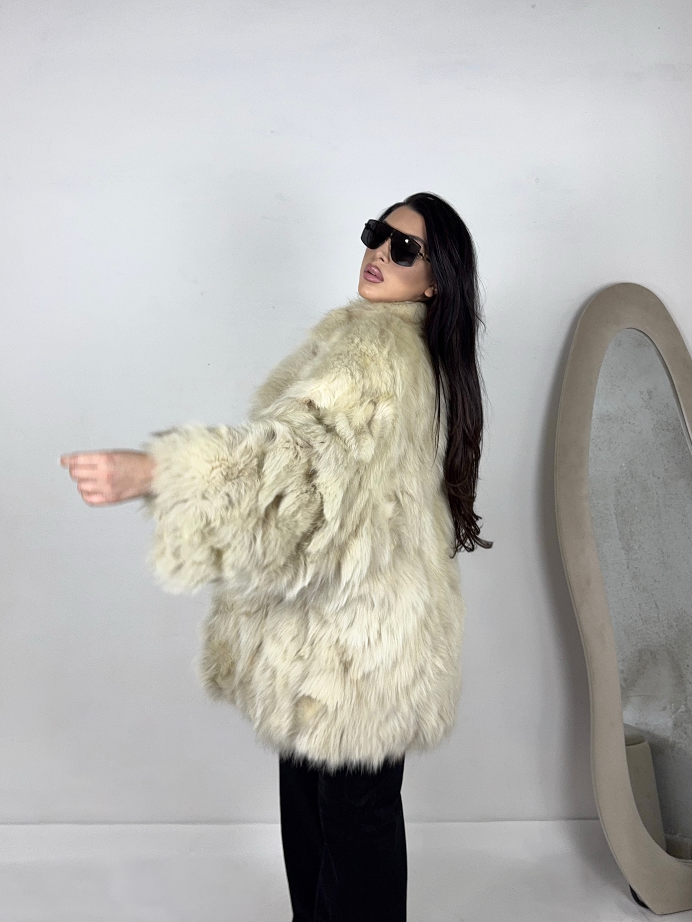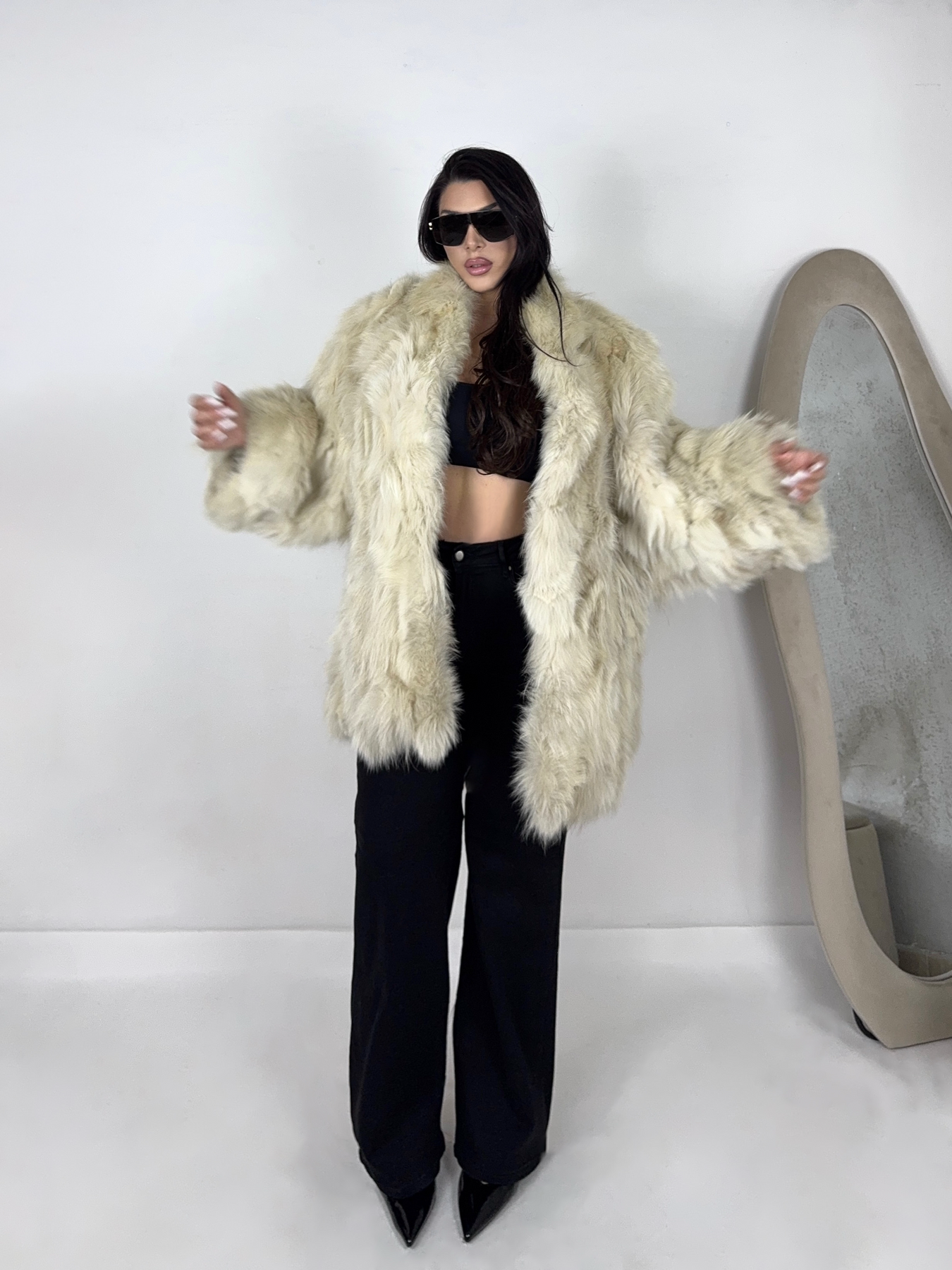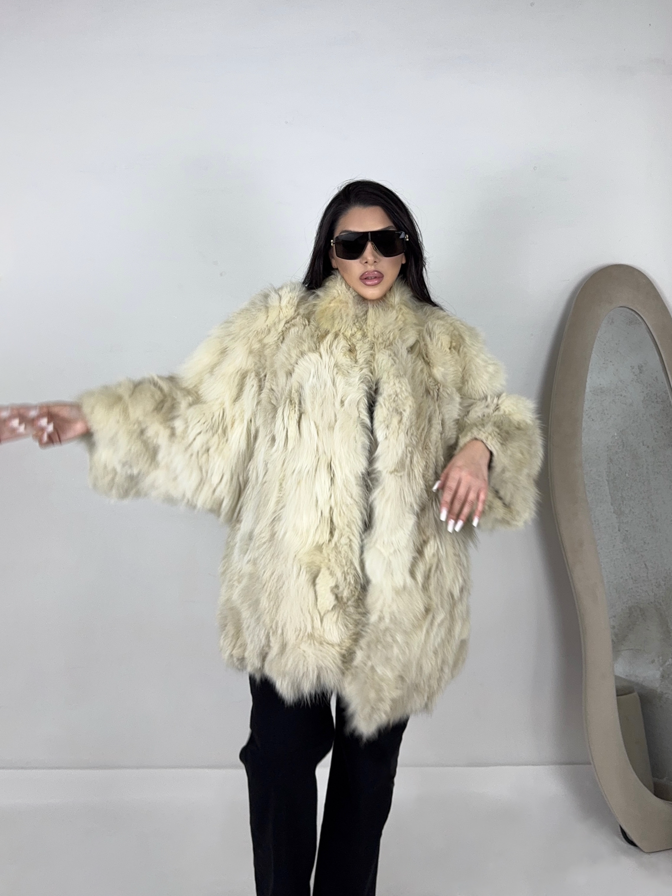 Un capo maestoso e senza tempo: pelliccia oversize in volpe naturale, dal colore avorio caldo con venature delicate che donano luce e profondità.